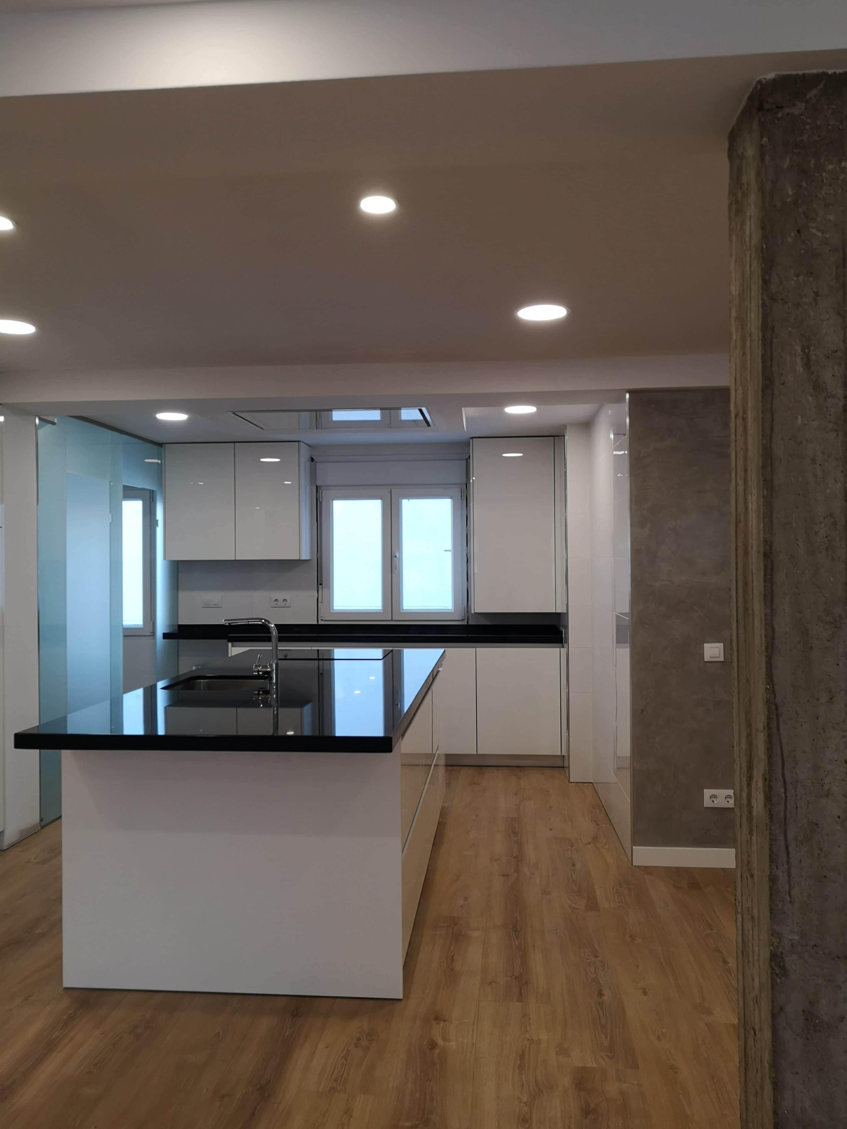 Aparte la reforma la completaba también una práctica isla dentro de la cocina de muebles tan inmaculadamente blancos en contraposición con la encimera totalmente negra; que contenía el fregadero y la vitrocerámica.