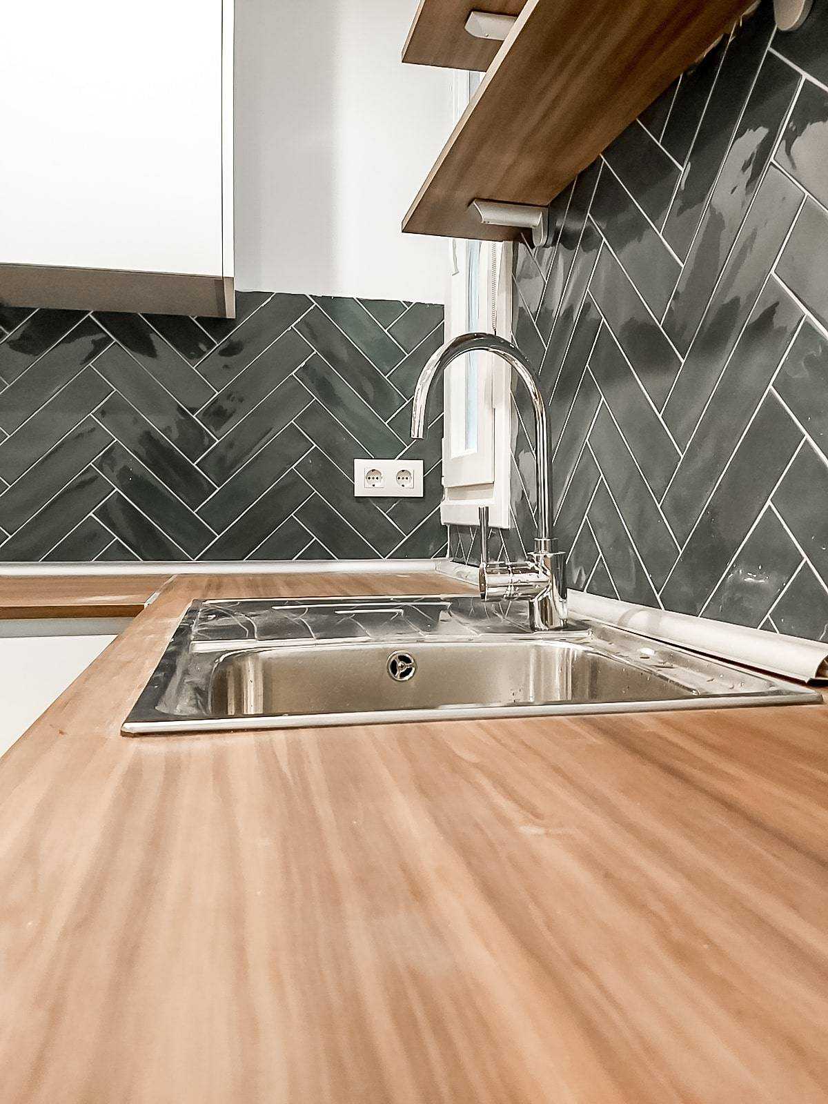 Muebles blancos de melamina con encimera de formica imitación madera de haya y azulejos negros puestos en espiga culminan una cocina rústica y retro con toques vanguardistas.